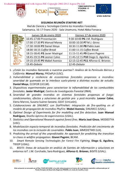 Los pasados 16 y 17 de enero se llevó a cabo la segunda reunión de la red STAFFIRE-NET en Salamanca y en la que tuvieron la oportunidad de participar los investigadores Daniel Moya (UCLM) y Javier Madrigal (INIA). Esta red que se formó para la petición de un red de excelencia, actualmente está financiada con fondos propios de la Universidad de Salamanca y participan grupos de investigación sobre incendios de un carácter multidisciplinar (físicos, matemáticos, biólogos, ingenieros forestales y de montes, etc.). Las conferencias de las jornadas están disponibles en la web del grupp SIMUMCC. Las conferencias de Daniel Moya y Javier Madrigal se pueden descargar o reproducir en el siguiente enlace: